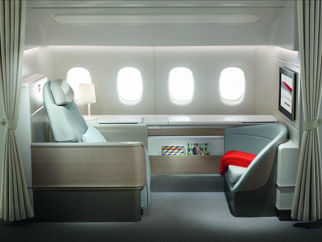 The recently renovated Air France suite features seats that recline 180° to transform into a bed, and a power sliding door for each suite.